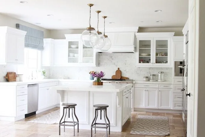 Browsing kitchen inspiration, I'm drawn to a classic white kitchen with bright white cabinets, gray and white counters like the popular carrara marble, a marble backsplash and brass accents that would match perfectly with our existing decor in the dining room. I love what Becki Owens pulled together in this kitchen redesign. Scroll down for some more of my favorites that depict a classic white kitchen combo.