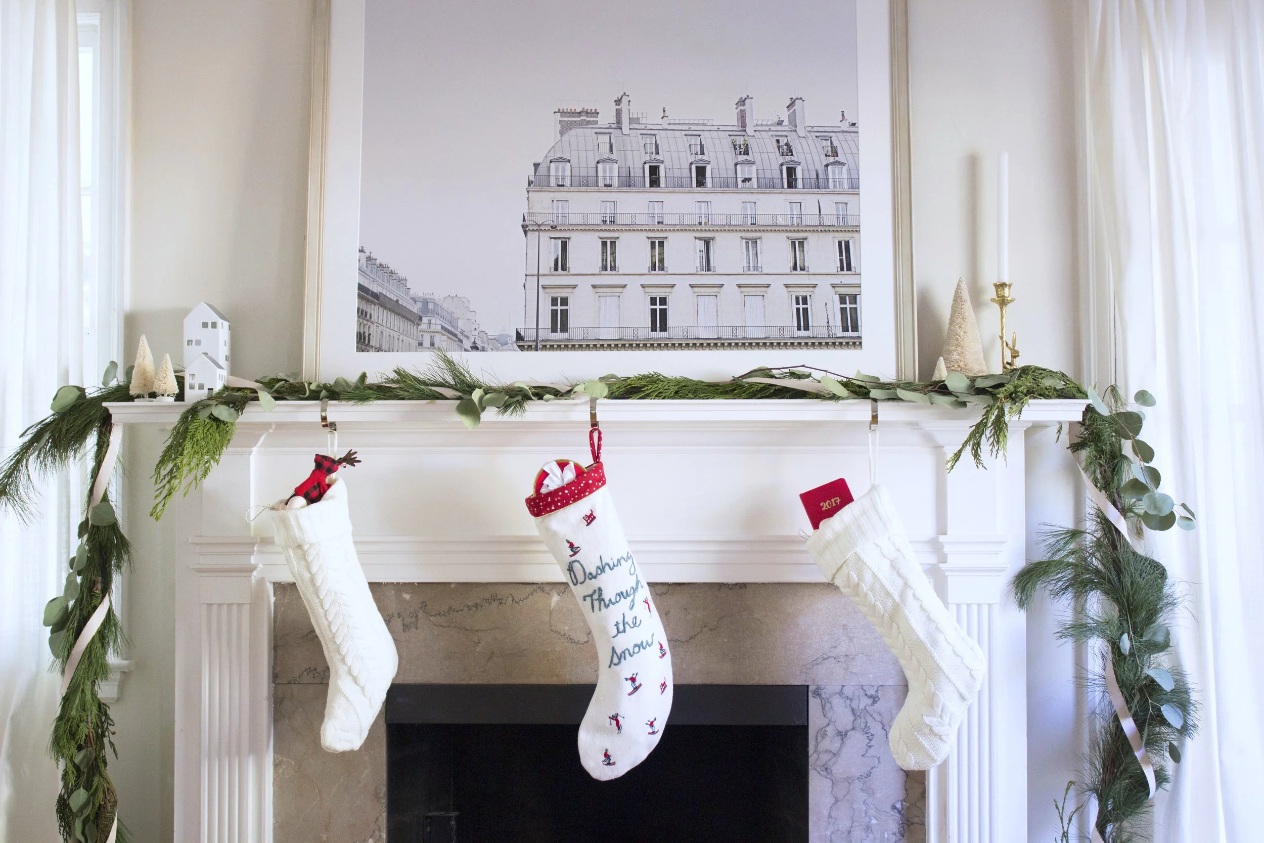 I love a traditional Christmas stocking - needlepoint with a Christmas scene and your name. LOVE. This year I wanted something a little more modern and I found this adorable Dashing Through The Snow stocking with little ski characters on it. It kicked off my whole scheme. I choose classic white cable knit stockings to pair with it and stuffed the stockings with treats. (If you haven't seen this line, it's awesome. Lots of stylish holiday wrapping paper, gift boxes, ornaments and ribbons. I love their office supplies too. Check it out because Target now carries it!).
