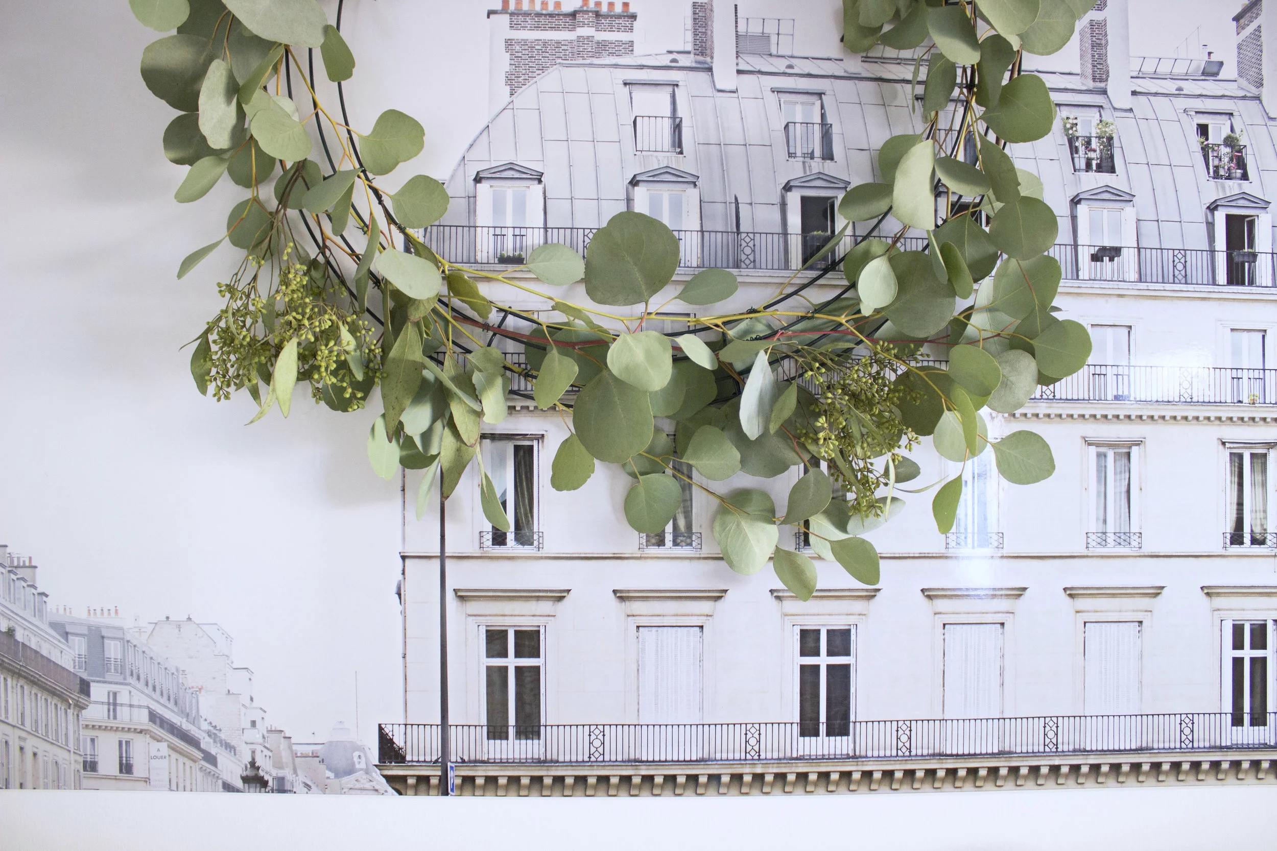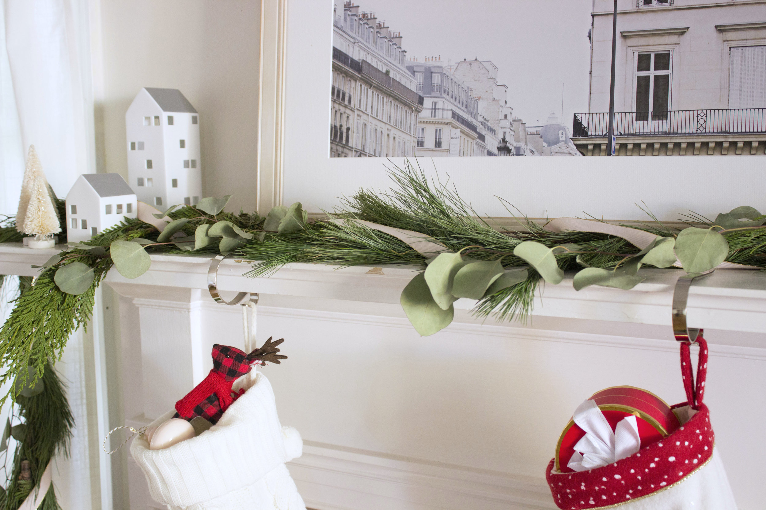 To make the mantel feel more like the holidays I made a modern wreath out of the extra eucalyptus using the leaves and seeded eucalyptus. You can still see the wire wreath frame, but I liked how that tied together with the wire basket for the firewood.