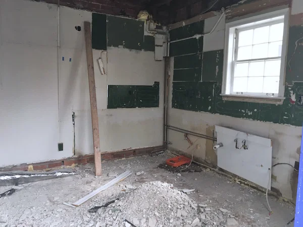 The plans are to gut the existing kitchen and take down the wall between the kitchen and the dining room to add a bathroom and open up the floor plan.