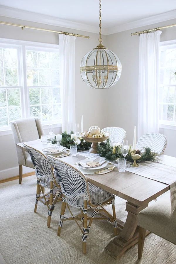 Pick a centerpiece—one of the most important decorations on the table as the focal point. You’ll want to keep in mind your guests when choosing the height so you don’t block conversation across the table. A great tip here is to use a simple elevated wood bowl. It’s a very versatile piece that can be switched up from one holiday to the next based upon what you put in the bowl. For Thanksgiving, I filled the bowl with assorted mini pumpkins.
