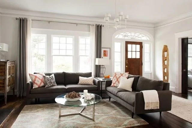 When a front door opens directly into the center of a room, a sectional is often the strongest solution. Placing the long side against the main wall allows the "return" of the sofa to act as a subtle gatekeeper for the entry.